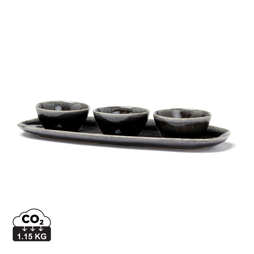 Piatto da portata in gres con tre piccole ciotole. Possibilità illimitate: Tapas, salsine o snack. Il piatto da portata da solo è ottimo per servire insalate o tartine. Nomimono trae ispirazione dalla natura e dalla terra che ci circonda, creando questa gamma rustica nei toni naturali della terra in cui non esistono due articoli uguali. Il giapponese incontra lo scandinavo, il rustico incontra il moderno. Oggetti da collezione per un servizio di piatti semplici e stimolanti. Ogni articolo è fatto a mano e unico. Ogni articolo viene sottoposto a tre passaggi di colla per ottenere il giusto tipo di finitura. Lavabile in lavastoviglie e adatto al microonde.