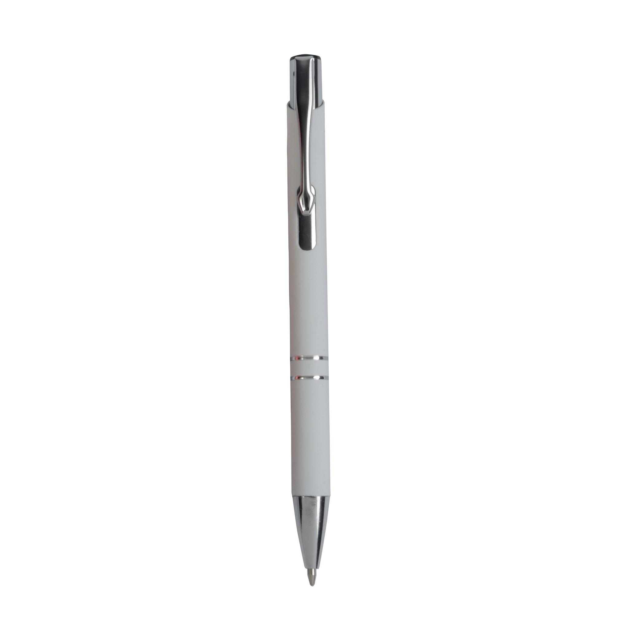 Penna a scatto in alluminio gommato con decorazione a 2 anelli e particolari cromati. Variante in royal disponibile in 8 colori