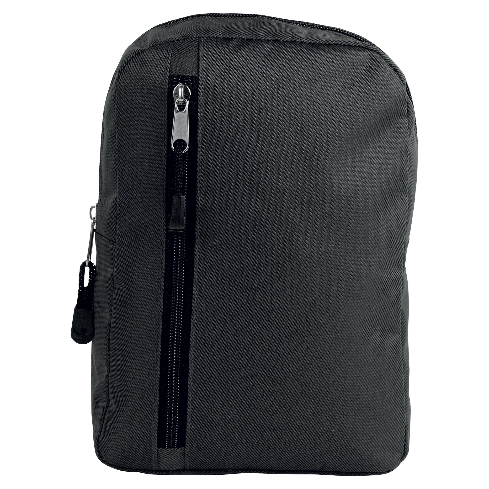 Borsello in poliestere 600D con tracolla regolabile agganciabile sia per spalla sinistra che per spalla destra; indossabile frontalmente, come tracolla o zaino monospalla
