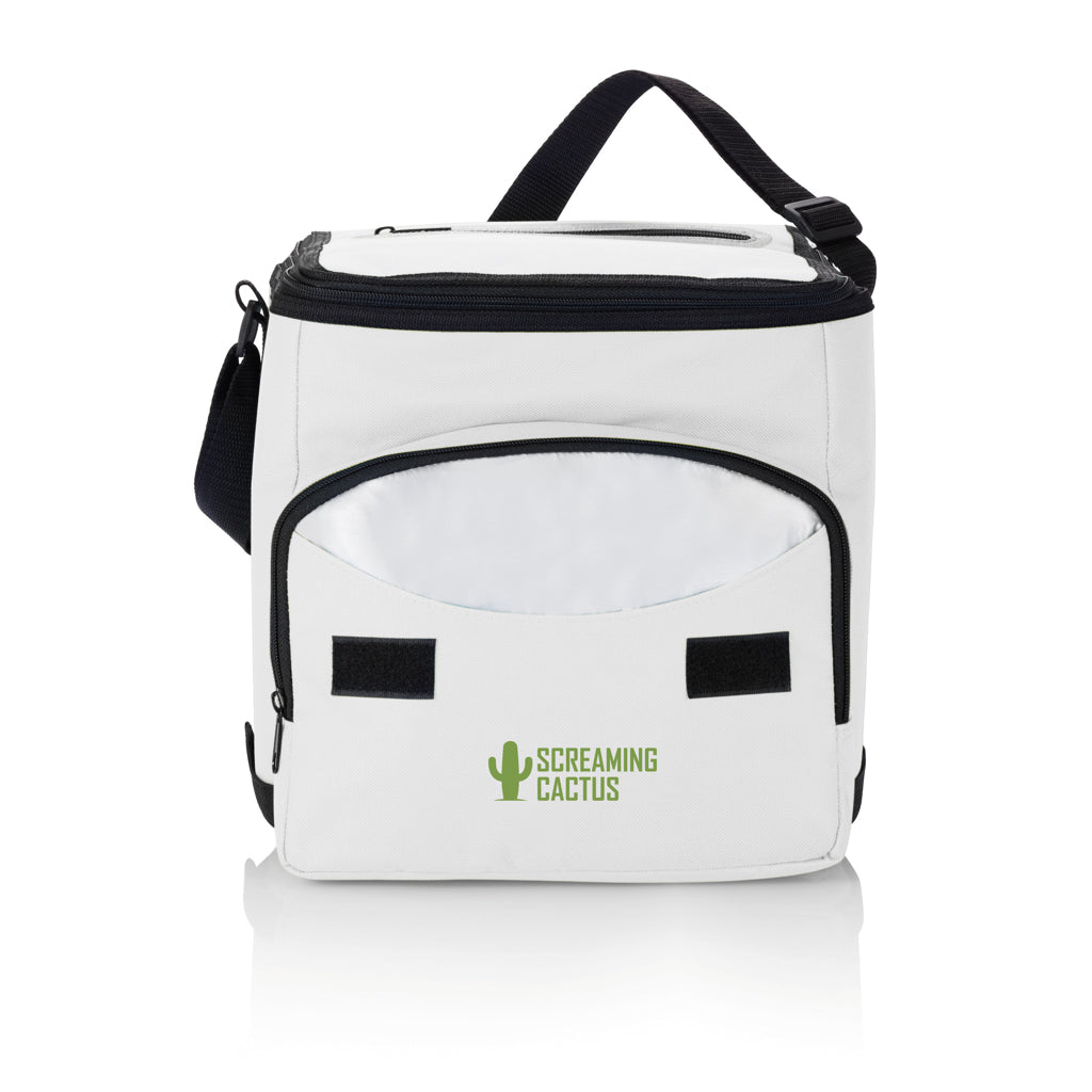 Borsa frigo in 600D con interno in color argento per mantenere cibo e bevande sempre fresche. Sulla parte frontale, c’è una tasca aggiuntiva nella quale riporre altri oggetti. Capacità L 13