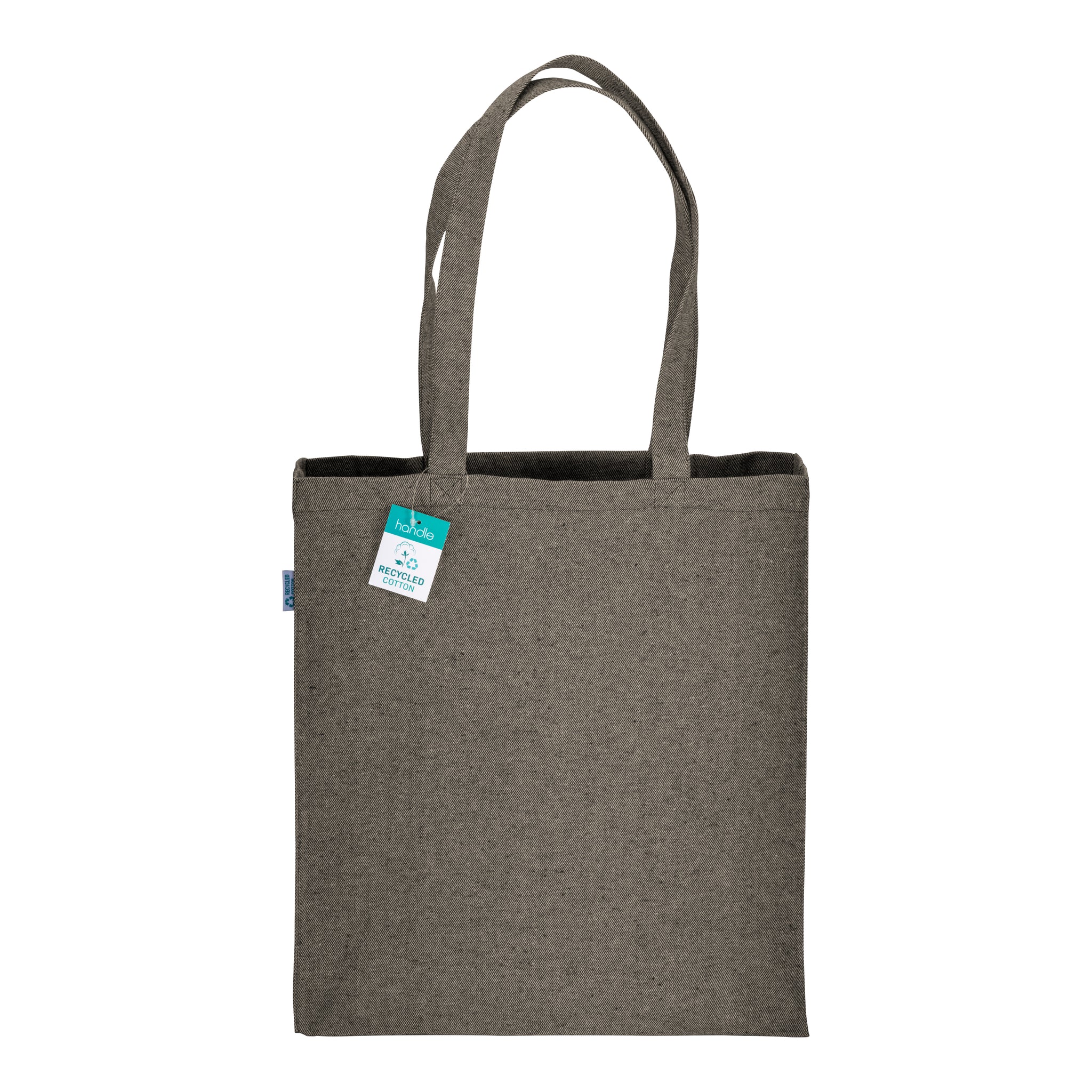 Shopper in cotone riciclato 280 g/m², manici lunghi e soffietto. Variante in nero disponibile in 10 colori