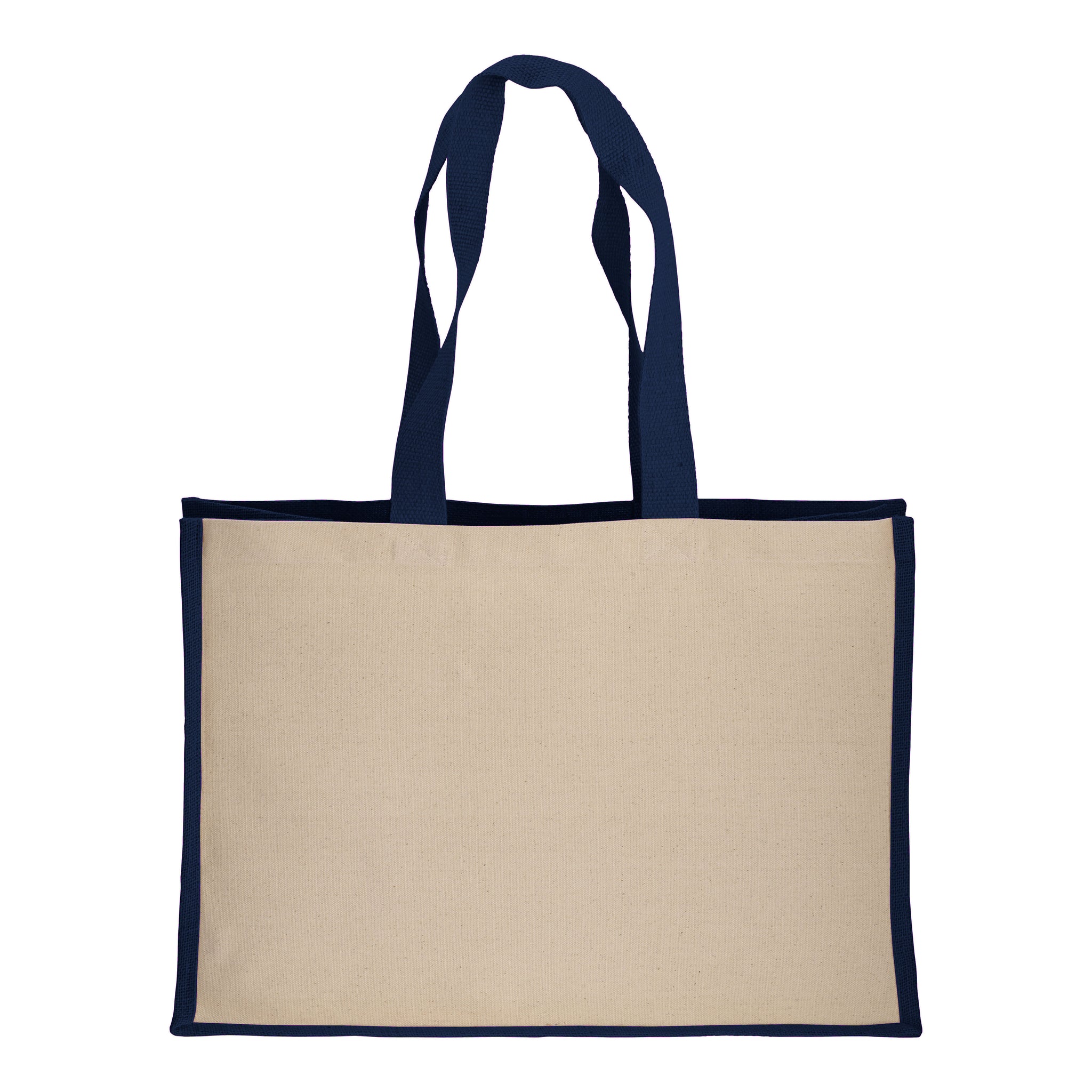 Shopper in cotone 280 g/m² con soffietto dettagli in juta, manici lunghi. Variante in blu disponibile in 4 colori