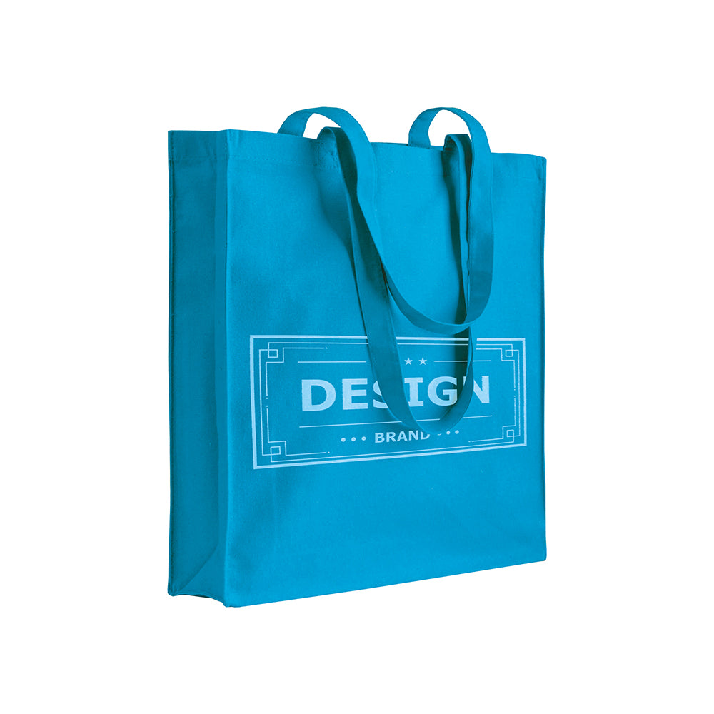 Shopper con soffietto in cotone 220 g/m², manici lunghi. Variante in azzurro disponibile in 12 colori