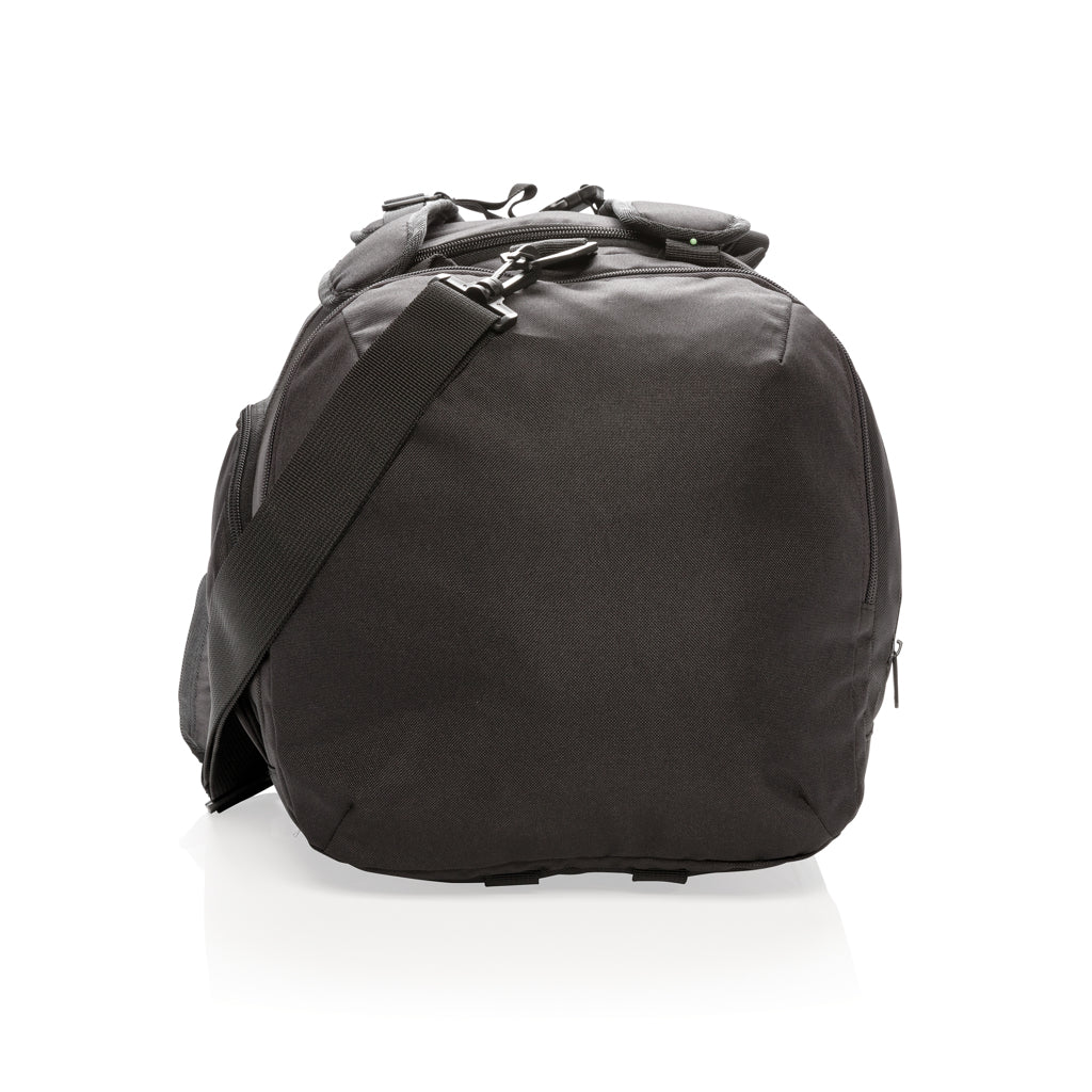 Borsa 2 in 1 leggera in poliestere 1680D e 600D. La potrai utilizzare sia come borsa che come zaino. Include un grande scomparto con apertura a U con cerniera, uno scomparto porta scarpe o indumenti sporchi e una tasca laterale con cerniera. Sul retro c'è una tasca porta bottiglia e una per accedere velocemente alla parte interna dello zaino. Ha 2 taschini frontali con cerniera con protezione RFID. Spallacci facili da regolare. Senza PVC. Capacità L 48