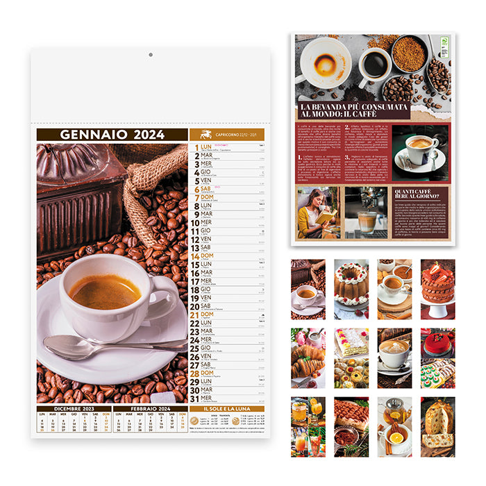 Calendari da parete 2024 da personalizzare con logo nella testata con adesivo digitale o serigrafia, hanno le seguenti caratteristiche: illustrato mensile 12 fogli, carta patinata 70 g., testata termosaldata, festività internazionali, retro in quadricromia. I calendari personalizzati 2024 sono dei gadget utili da usare durante tutto il corso dell'anno, per questo motivo vengono utilizzati come articoli promozionali per rendere sempre visibile il tuo logo. Puoi inserire questi gadget personalizzati nei tuoi regali natalizi aziendali.