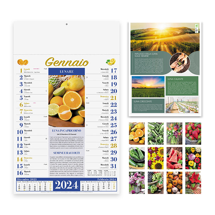 Calendari da muro promozionali da personalizzare con logo nella testata con adesivo digitale o serigrafia, hanno le seguenti caratteristiche: illustrato mensile 12 fogli, carta patinata 70 g., testata termosaldata, festività internazionali, retro in quadricromia. Se vuoi diffondere il tuo logo e renderlo visibile per tutto l'anno, puoi scegliere come gadget pubblicitari i calendari personalizzati 2024, sono articoli promozionali che possono essere dati in dono come gadget natalizi per regali aziendali.
