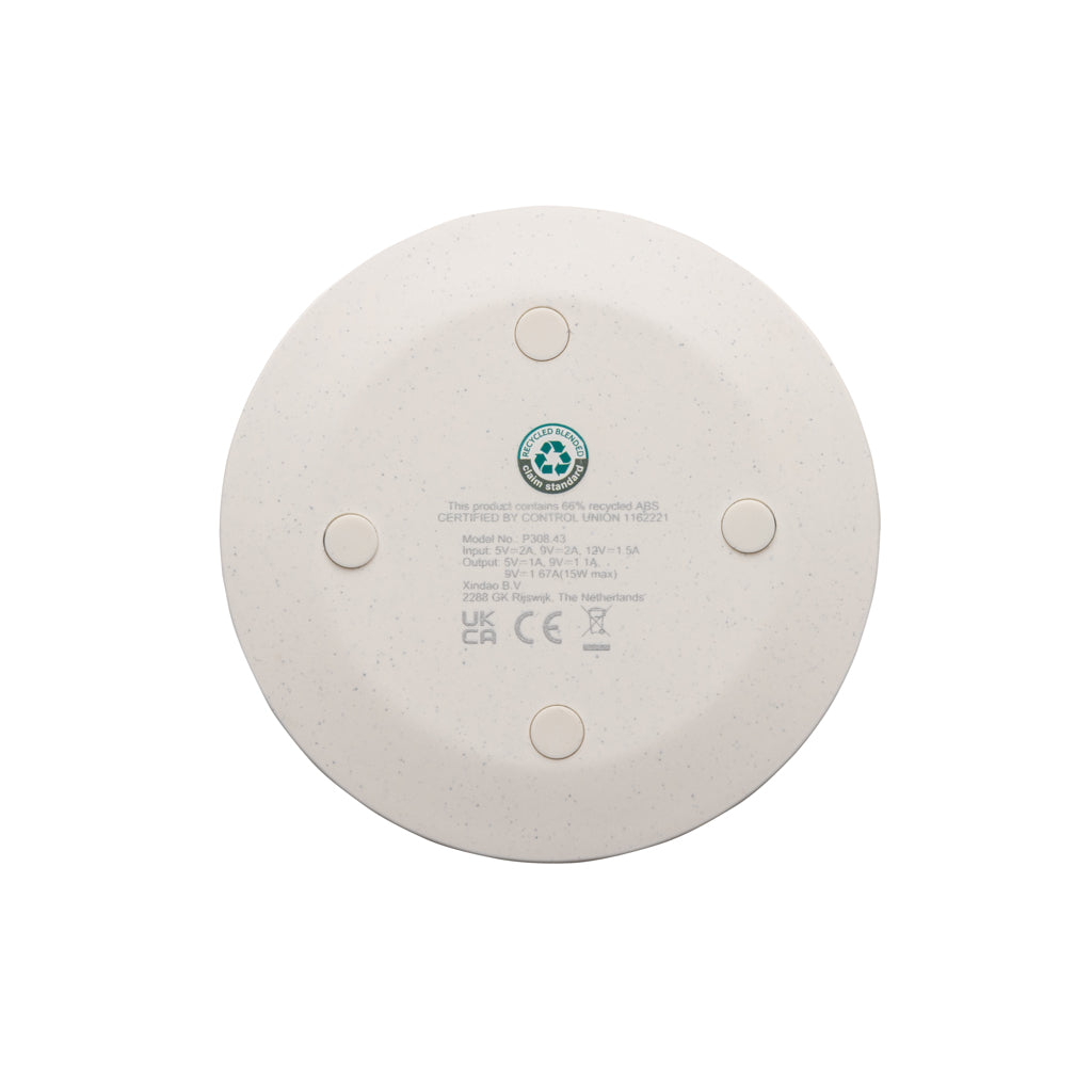 Caricatore wireless ultra veloce da 15W realizzato con ABS riciclato certificato RCS (Recycled Claim Standard). Contenuto totale riciclato: 66% in base al peso totale dell'articolo. La certificazione RCS garantisce una filiera completamente certificata dei materiali riciclati. Ricarica wireless compatibile con Android ultime generazioni, iPhone 8 e superiori. Articolo e accessori non contengono PVC. Include cavo di ricarica type C da 120 cm in TPE riciclato certificato RCS. Confezionato in scatola FSC mix. TypeC in; Input: 5V/2A; 9V/2A; 12V/1,5A; output wireless 5V/1A;9V/1.1A; 9V/1,67A (15 W).