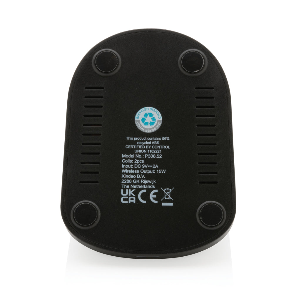 Supporto per caricabatterie rapido wireless da15W con due bobine di ricarica integrate. Ricarica sia in orizzontale che verticale. Realizzato con materiali riciclati certificati RCS (Recycled Claim Standard). Contenuto totale riciclato: 56% in base al peso totale dell'articolo. La certificazione RCS garantisce una filiera completamente certificata dei materiali riciclati. Include cavo di ricarica da 150 cm in TPE riciclato senza PVC. Sia l'articolo che gli accessori sono 100% senza PVC. Confezionato in scatola FSC mix. Ricarica wireless compatibile con Android di ultima generazione, iPhone 8 e versioni successive. Input12 V/1,67 A. Output wireless: 9 V/1,5 A 15 W.