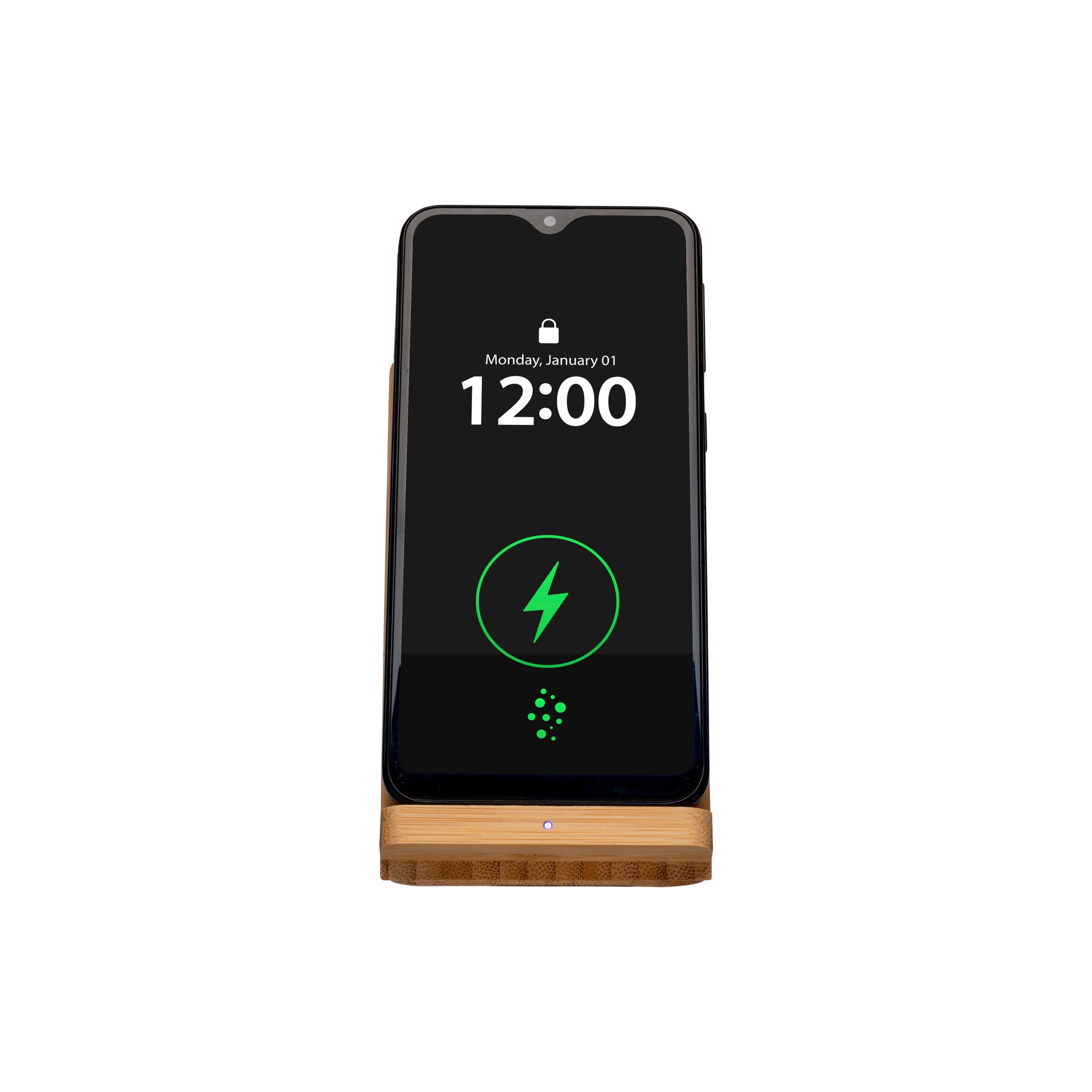 Caricatore Wireless in bambù. Uscita: DC5V/1A(5W). Compatibile con gli ultimi Androids, iPhone® 8, X e successivi.