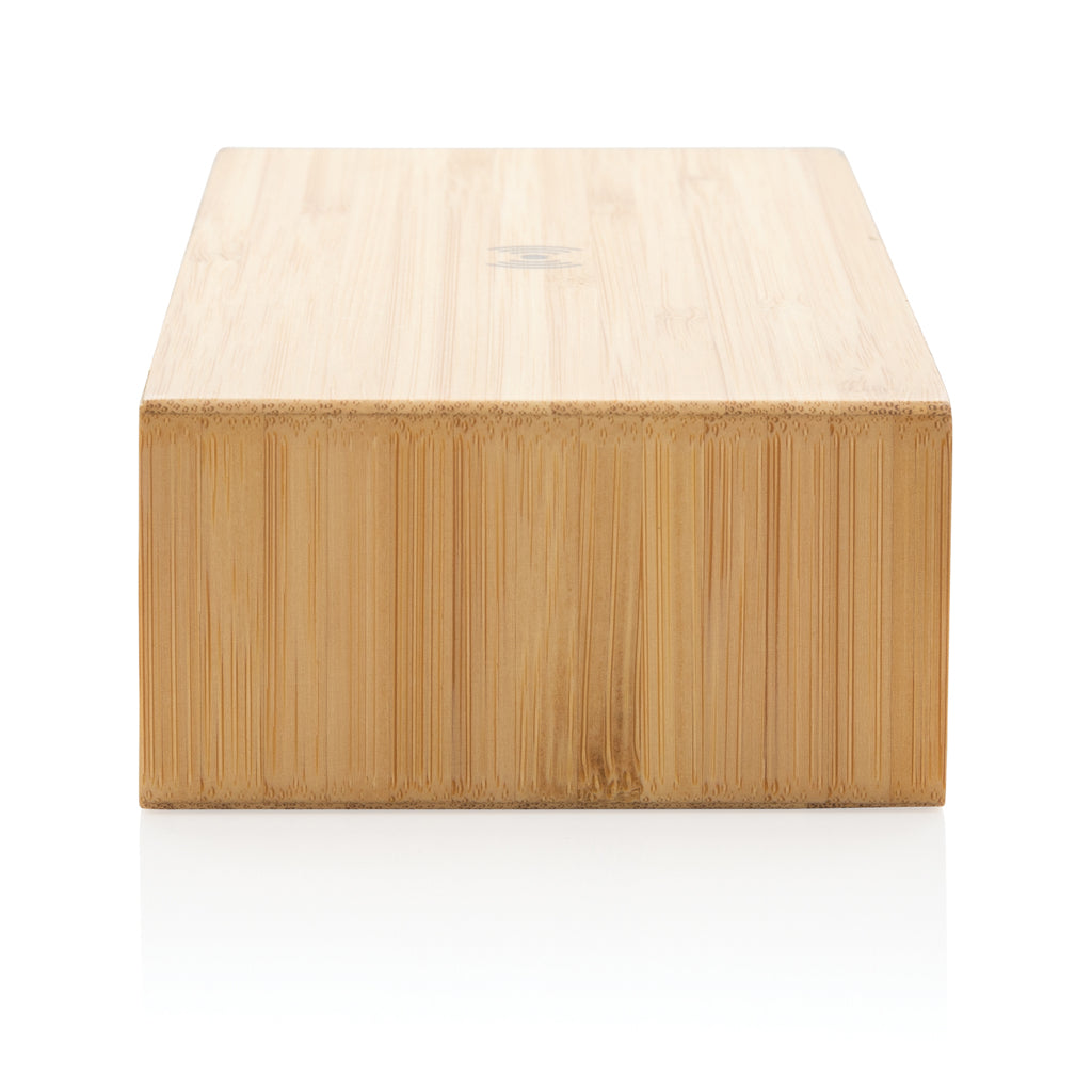 Orologio sveglia in bambù con caricatore wireless 5W e indicazione oraria 24h. Nella parte posteriore c'è una porta USB per la ricarica via cavo. Include un cavo micro USB da 150 cm che non contiene PVC. Compatibile con tutti i dispositivi che supportano la tecnologia Qi quali Android di ultima generazione o iPhone 8 e versioni successive. Input: 5V/1.5A; Output wireless : 5V/1A - 5W; 1 USB porta output, 5V/1A.
