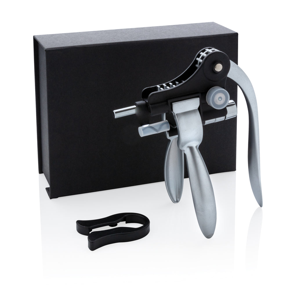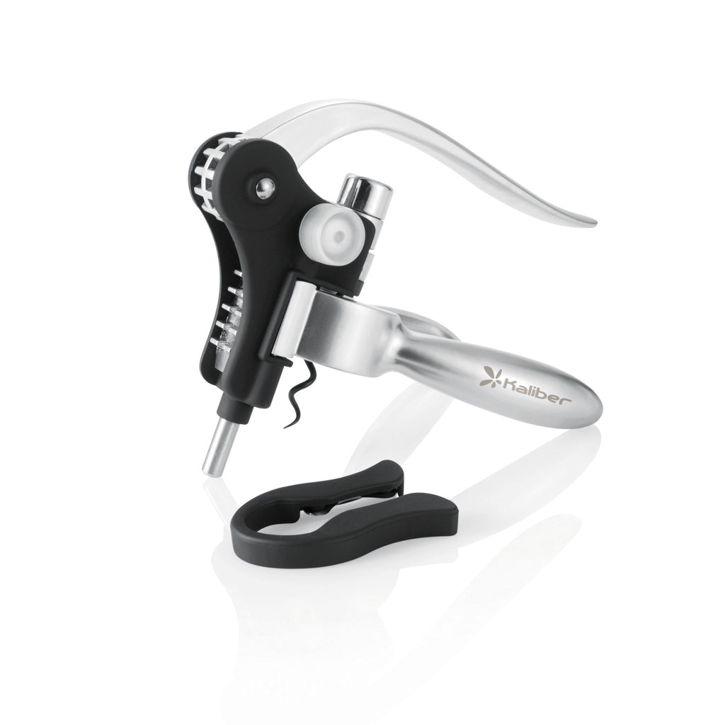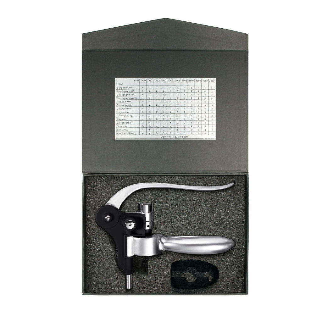 Cavatappi con meccanismo a leva in alluminio, con spirale in acciaio rivestita in Teflon, include leva capsule. In confezione regalo.