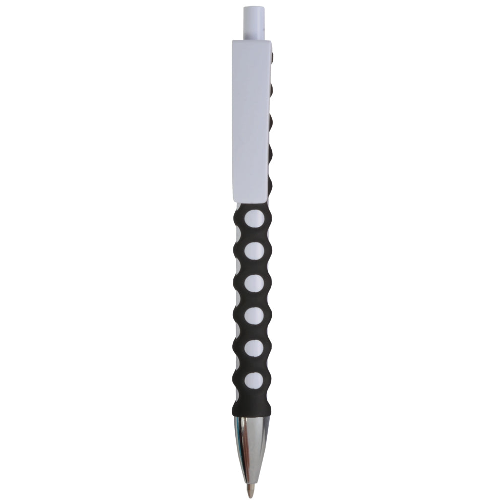 Penna a scatto in plastica con fusto, clip e pulsante bianchi, rivestimento gommato traforato colorato