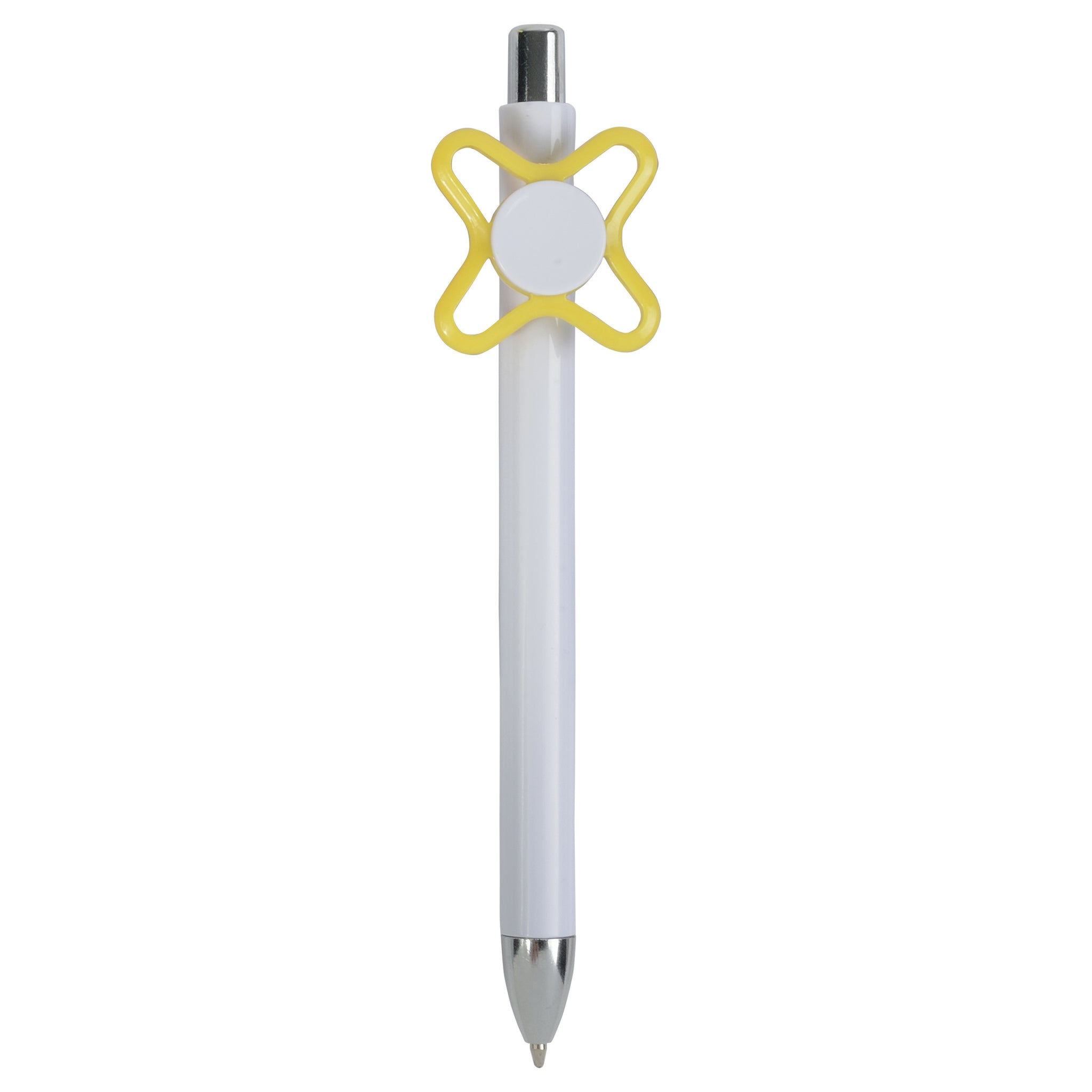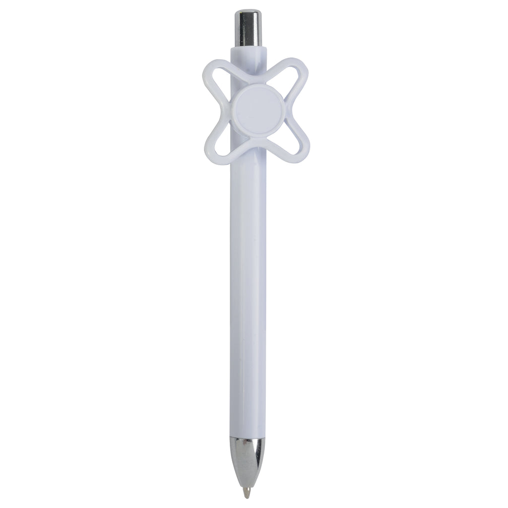 Penna a scatto in plastica bianca con spinner colorato. Spazio centrale dello spinner idoneo per logo resina