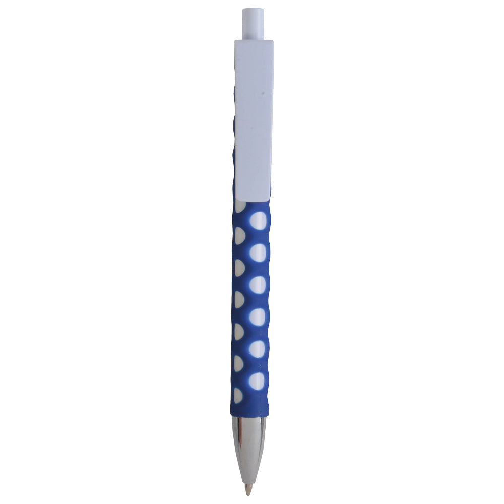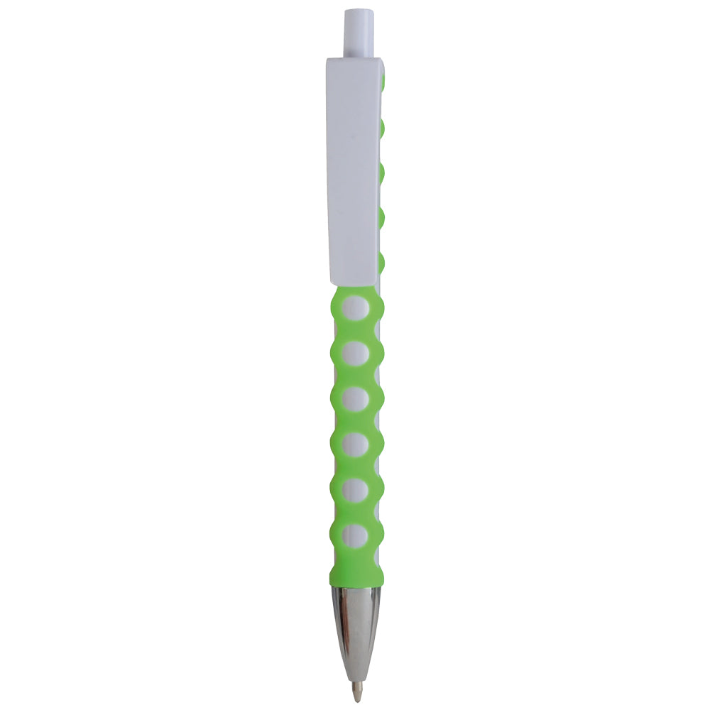 Penna a scatto in plastica con fusto, clip e pulsante bianchi, rivestimento gommato traforato colorato
