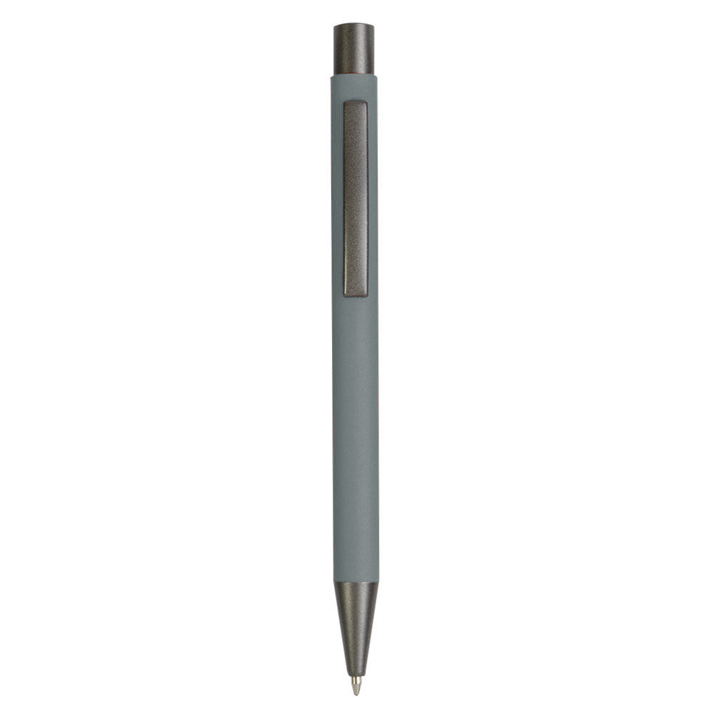 Penna a scatto in metallo gommato con particolari bruniti. Modello in blu disponibile in 9 colori