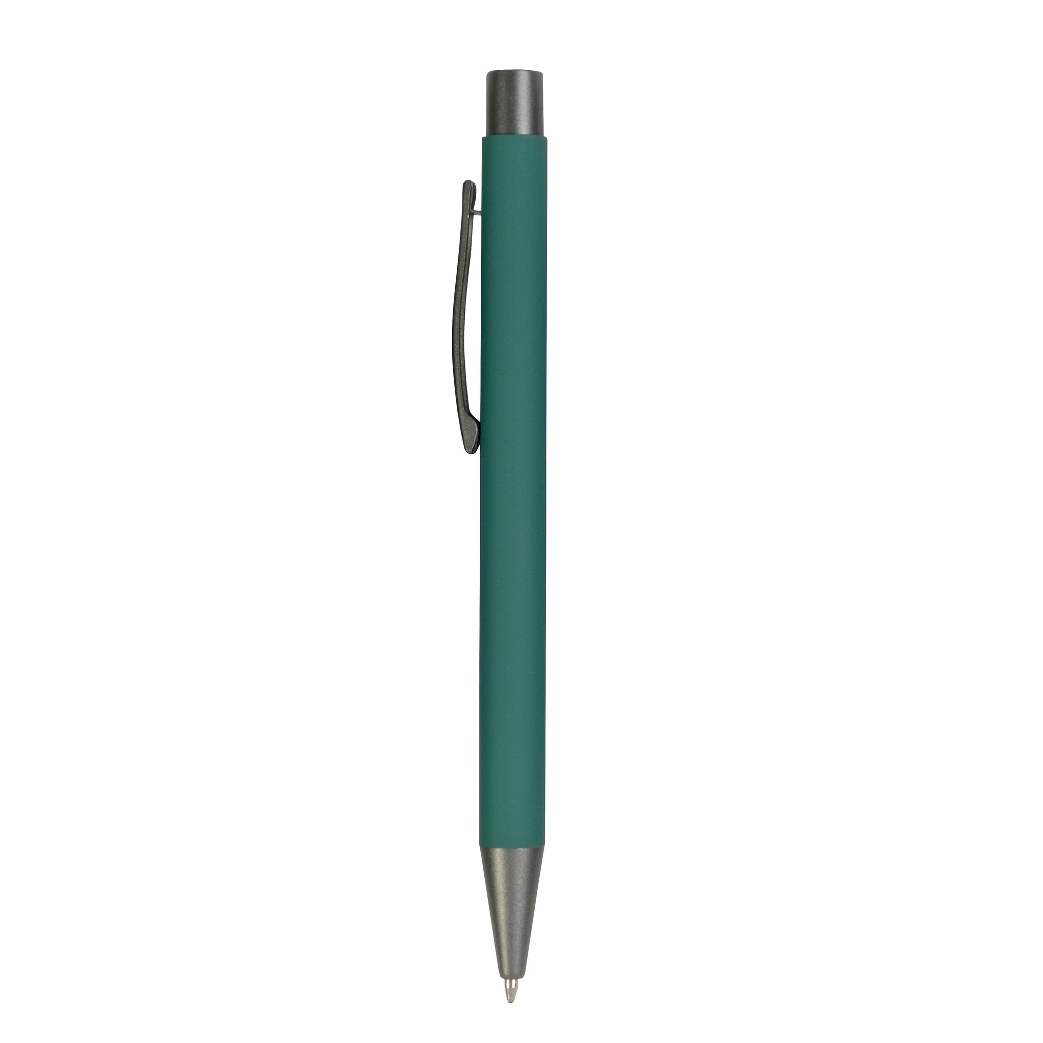 Penna a scatto in metallo gommato con particolari bruniti. Variante in verde disponibile in 9 colori