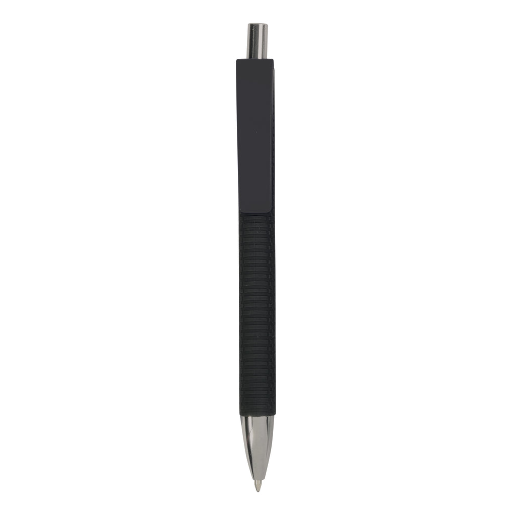 Penna a scatto in plastica con fusto gommato effetto pneumatico nero, con clip larga. Modello in nero disponibile in 8 colori