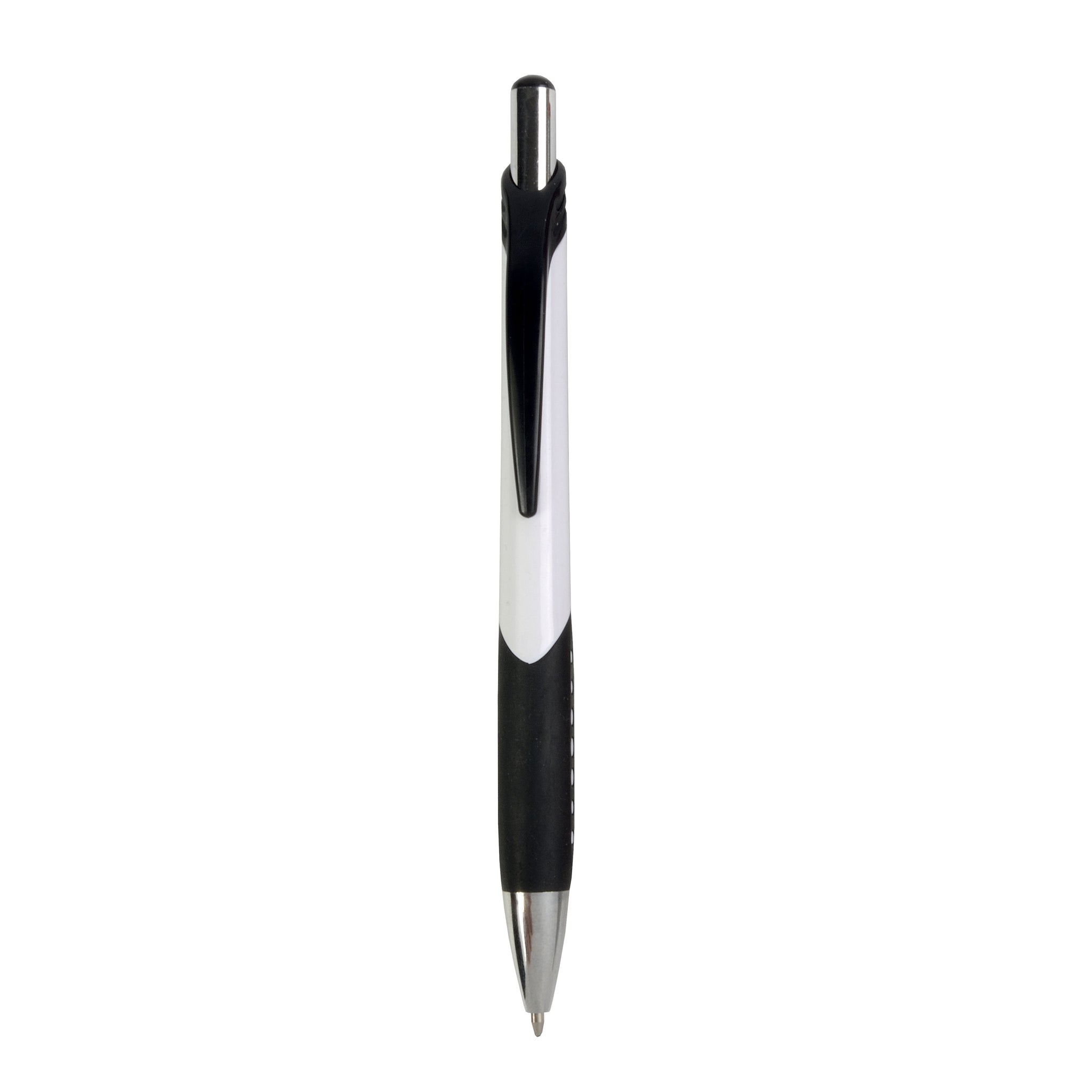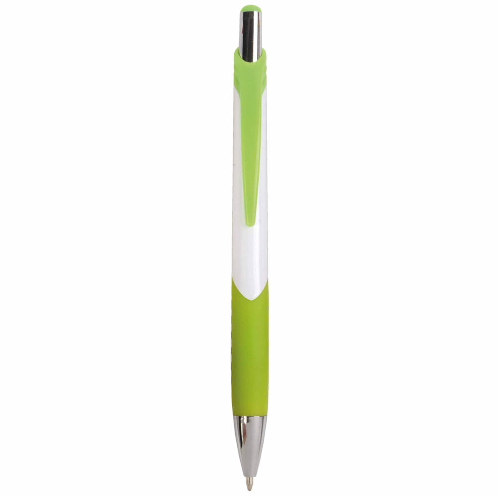 Penna a scatto in plastica con fusto bianco, impugatura gommata e colorata, in tinta con la clip e il particolare del pulsante. Punta e pulsante color cromato