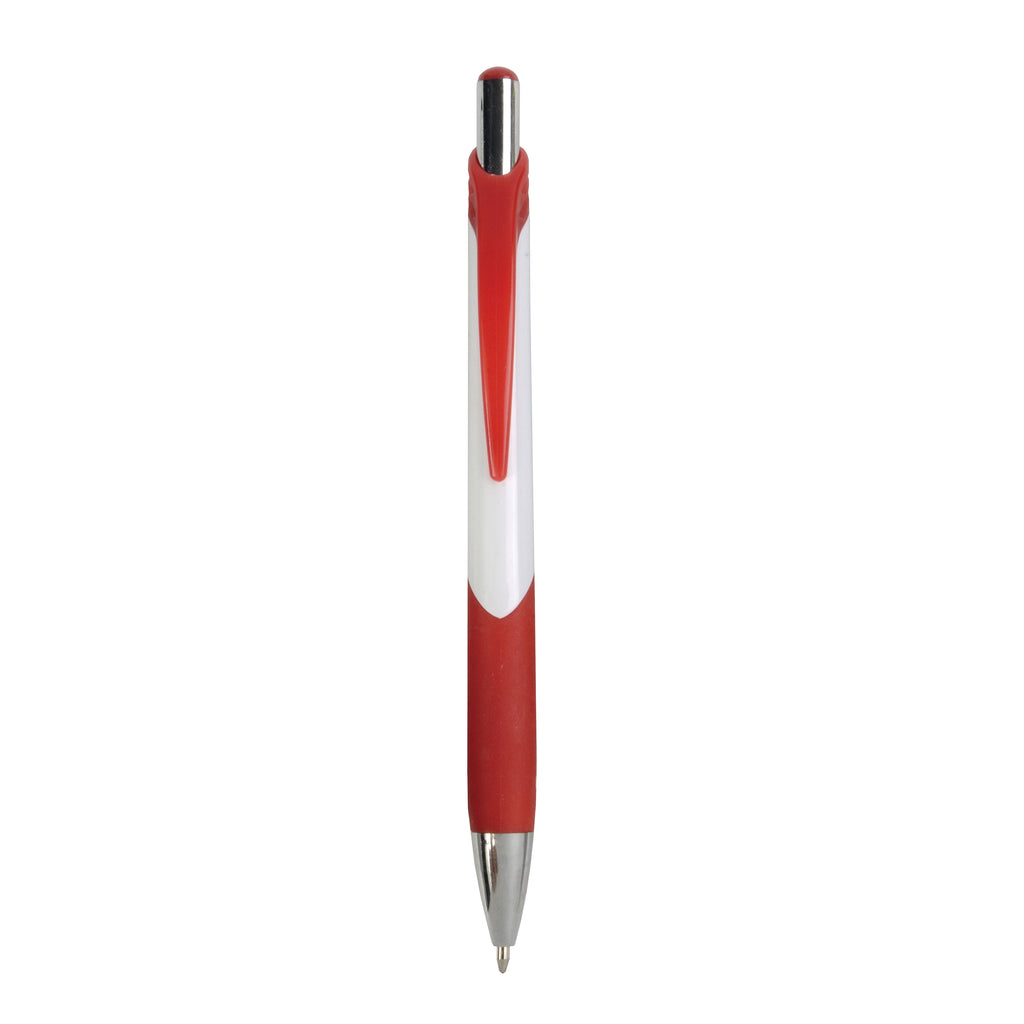 Penna a scatto in plastica con fusto bianco, impugatura gommata e colorata. Articolo in rosso disponibile in 6 colori