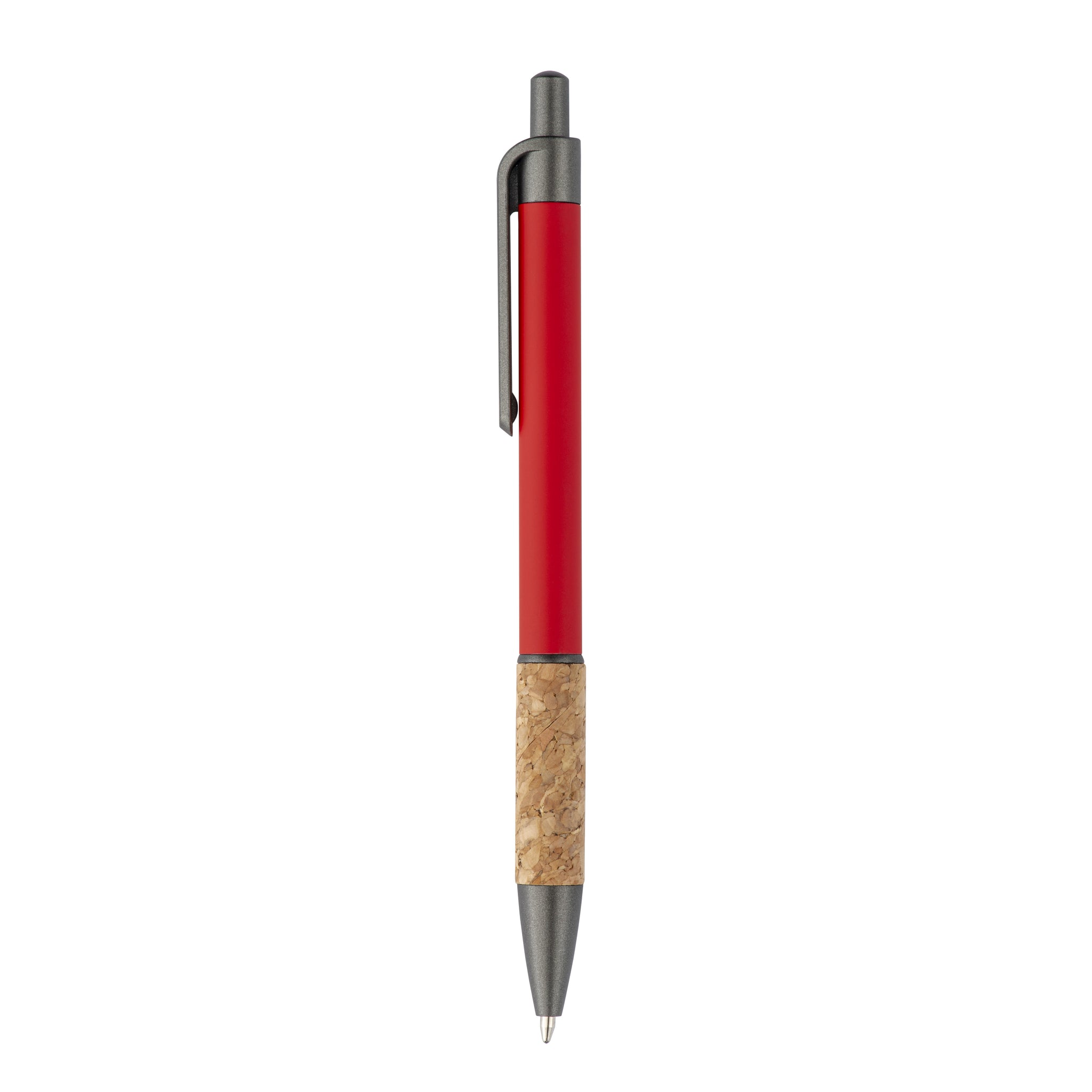 Penna in alluminio con impugnatura in sughero, clip, top e punta bruniti. Articolo in rosso disponibile in 7 colori