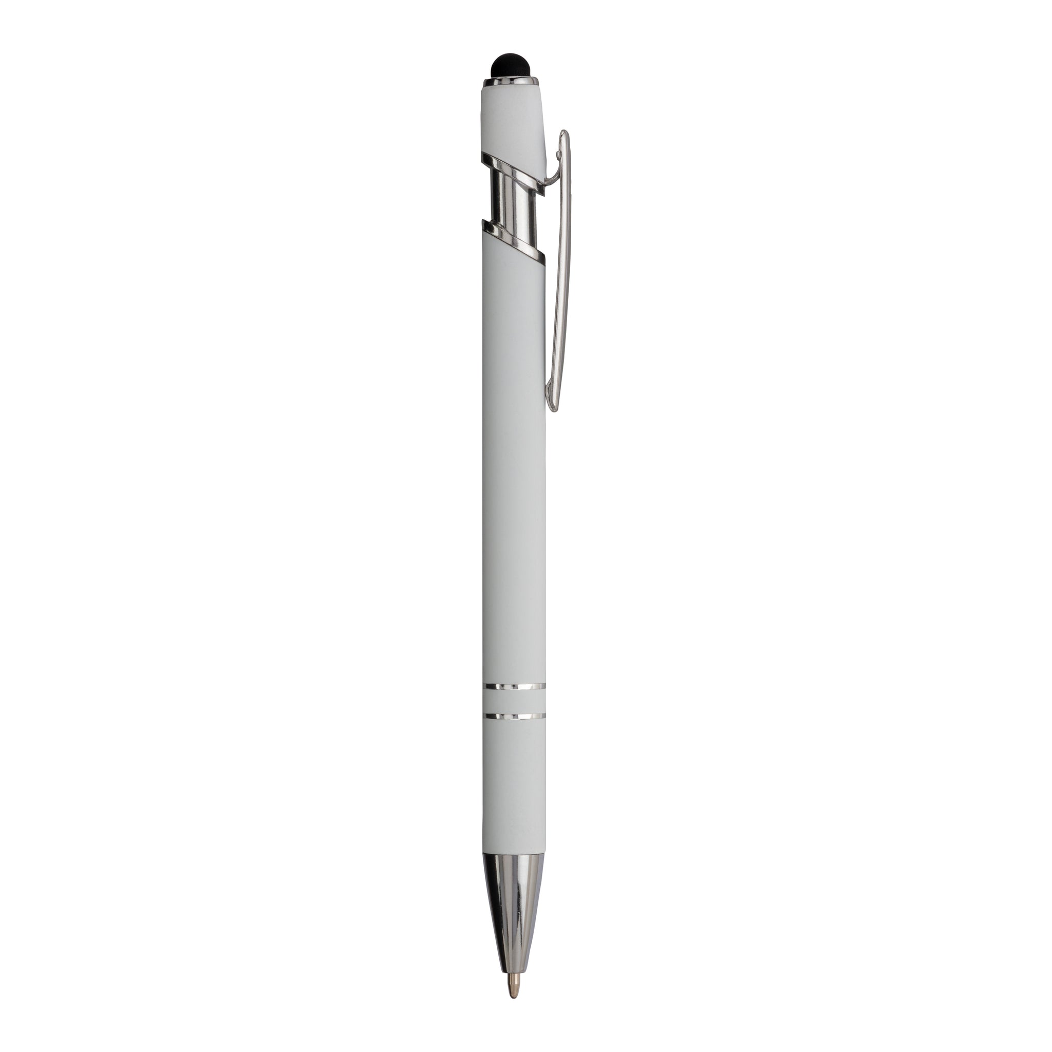 Penna a scatto in alluminio gommato con gommino per touch screen e clip in metallo. Per incisione laser