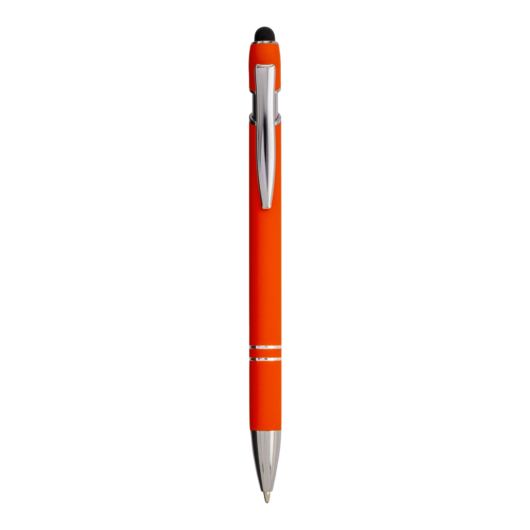 Penna a scatto in alluminio gommato con gommino per touch screen e clip in metallo. Articolo in arancione disponibile in 7 colori