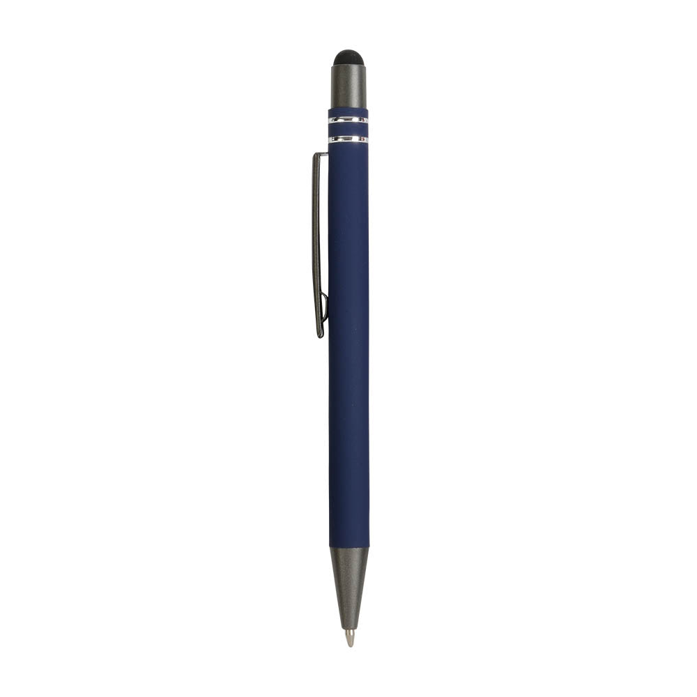 Penna a scatto in alluminio gommato con decorazione a 2 anelli e particolari bruniti con touch screen