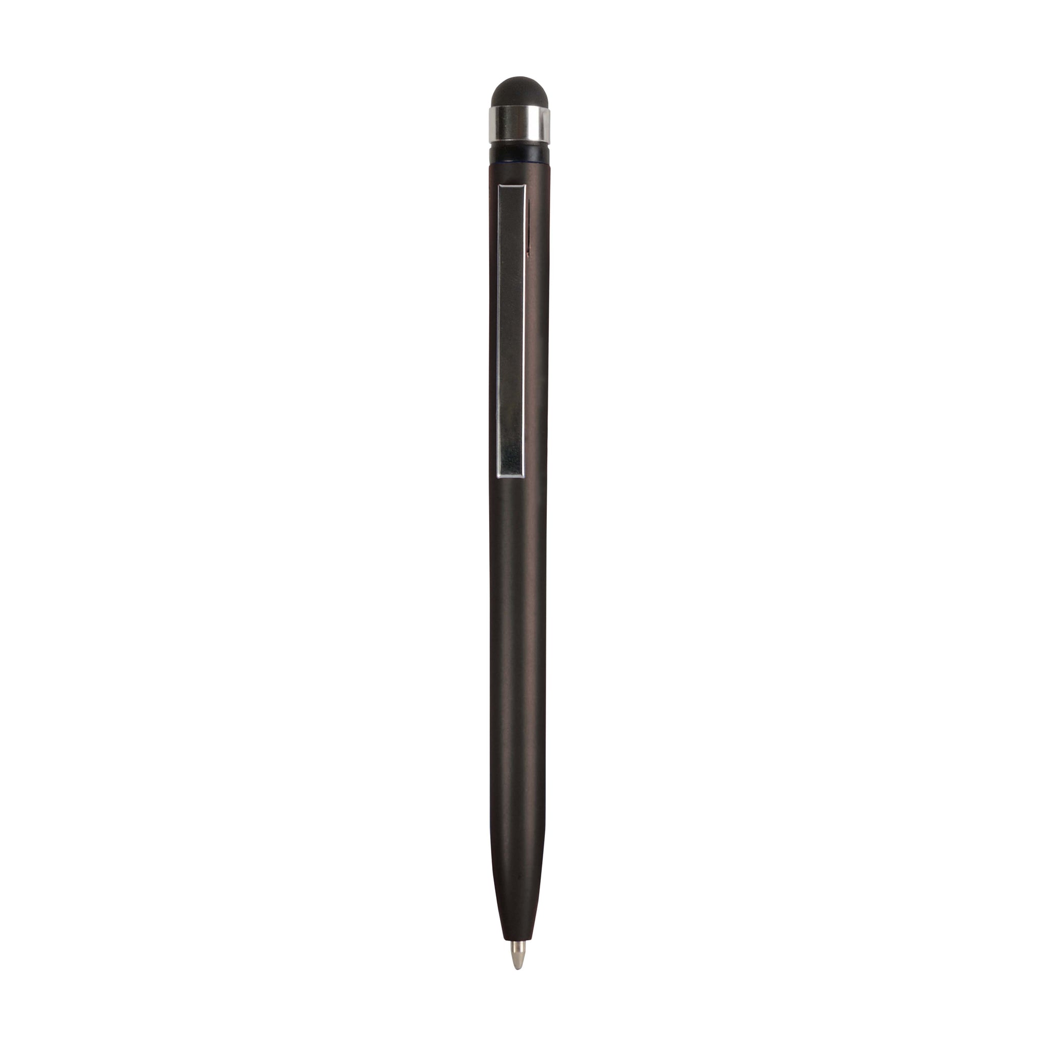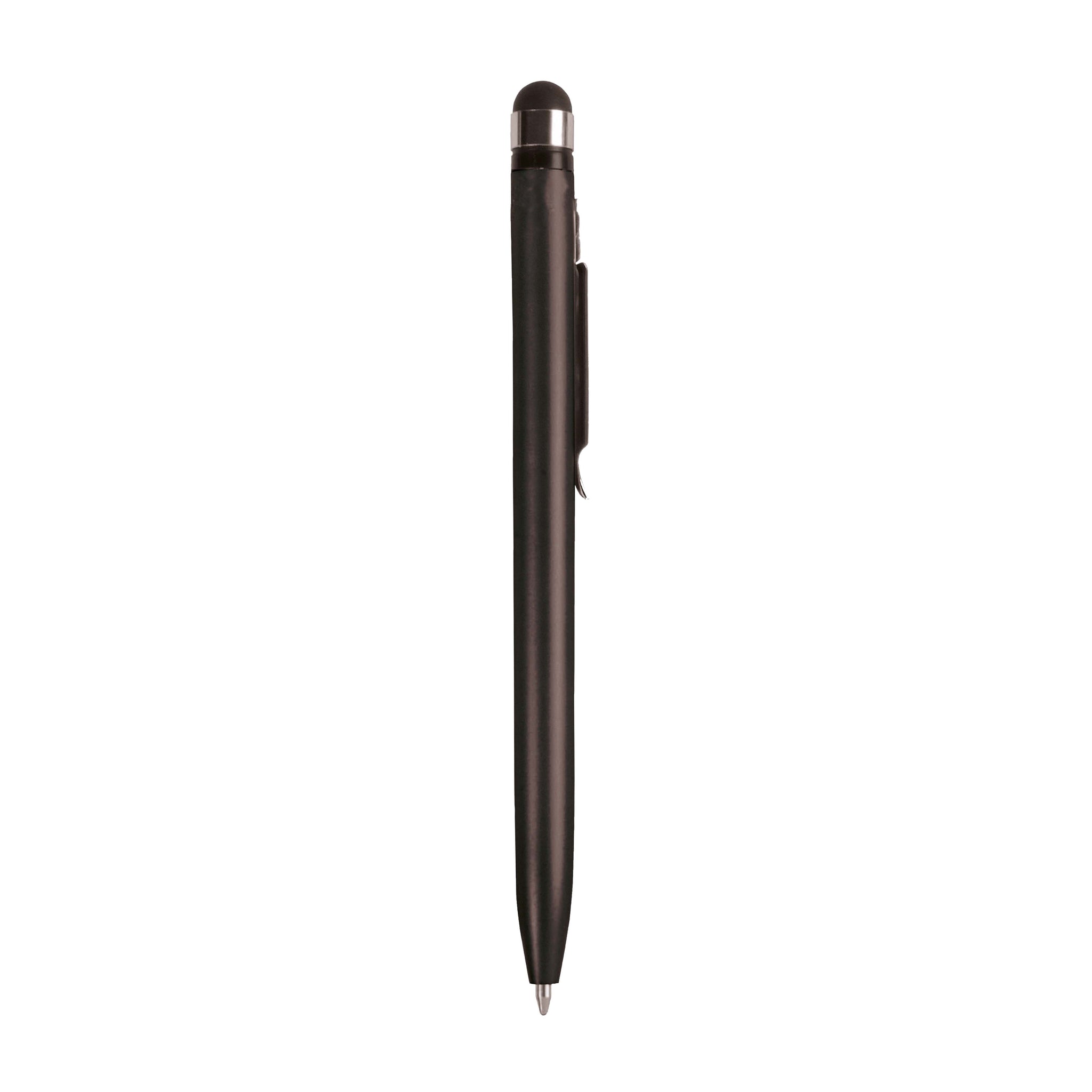 Penna twist in plastica con fusto colorato metallizzato con gommino per touch screen. Modello in nero disponibile in 6 colori