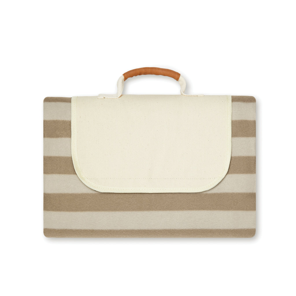Coperta picnic in morbido pile con tela di cotone e dettagli in PU. Il pile è realizzato in RPET certificato 100% GRS. La certificazione GRS garantisce una filiera completamente certificata dei materiali riciclati. La parte posteriore è realizzata in PEVA idrorepellente. Il design intelligente la rende facile da ripiegare e portare con te. Contenuto totale riciclato: 58% in base al peso totale dell'articolo.