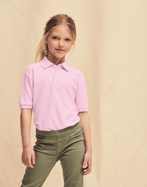 Polo da personalizzare con stampa o ricamo del logo per abbigliamento personalizzato bambino, da 180 gm² (bianco: 170 gm²), 65% poliestere, 35% cotone, fettuccia al collo, abbottonatura con 2 bottoni, bottoni in tinta, colletto e bordo delle maniche a costine, easy care, easy wear.