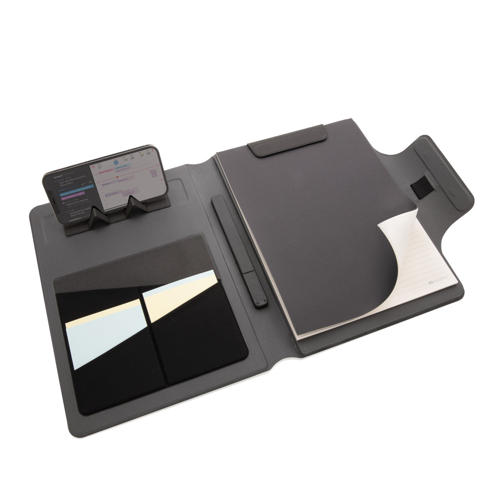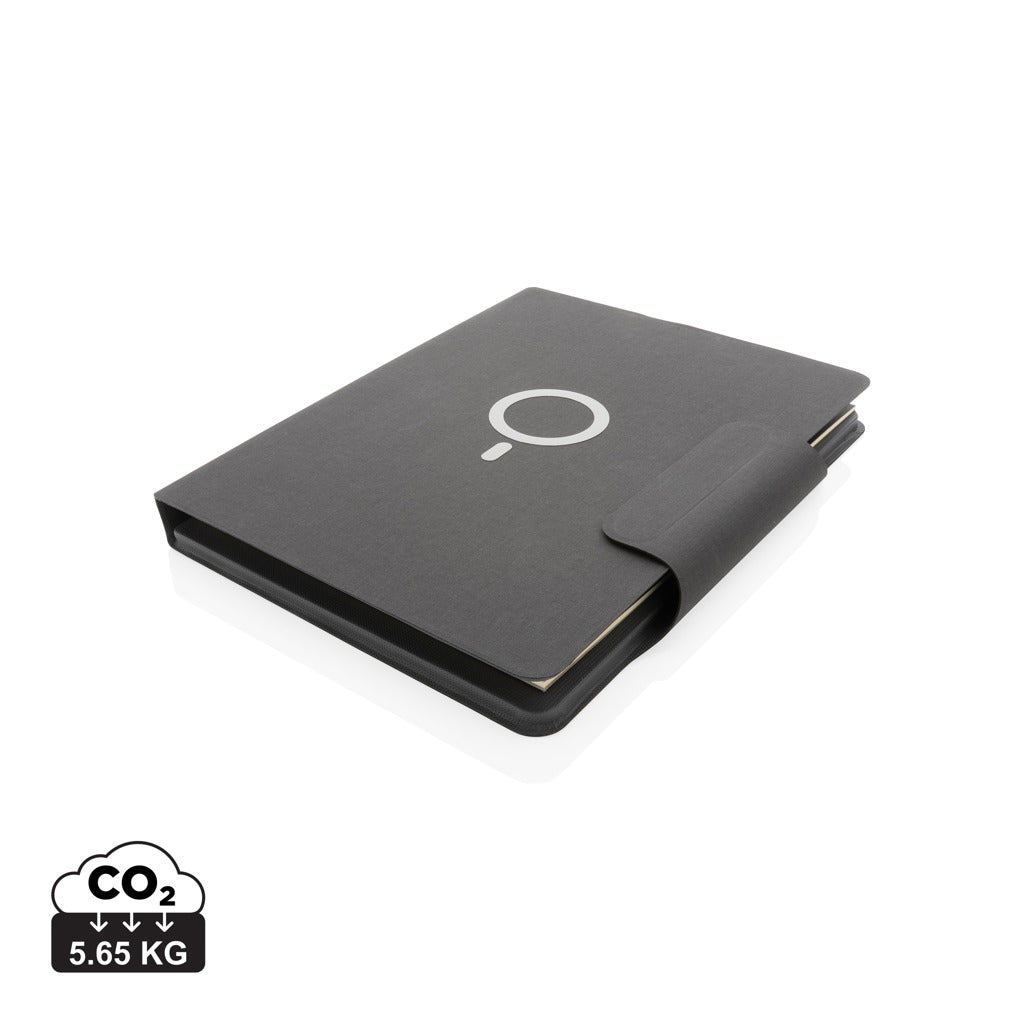 Ricarica il tuo dispositivo mobile in modalità wireless alla massima velocità grazie a questo portadocumenti A4 in PU con caricatore wireless magnetico da 10W integrato. Metti il tuo smartphone (iPhone 12 o versioni successive) vicino al caricabatterie wireless e il telefono si allineerà perfettamente con i magneti all'interno. Il caricabatterie wireless da 10W è compatibile con tutti i dispositivi QI (Iphone 8 e versioni successive e dispositivi Android) Input type C 9V/2A ; output wireless 9V/1.1A; output type C 9V/2A. Il taccuino include 20 f pagine a righe da 80 gm². 9V/2A ; output wireless 9V/1.1A; output type C 9V/2A. Con tasca per telefono/tablet e passante per penna. Include 19 magneti resistenti al calore N52H di alta qualità. Design registrato.