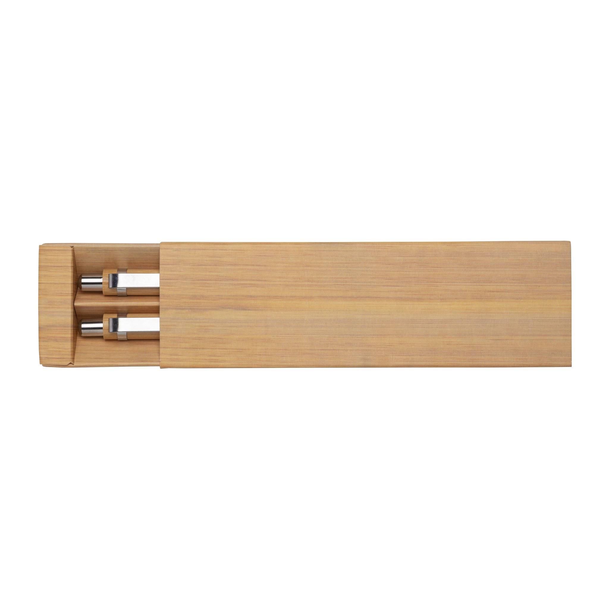 Set di due penne a scatto in bamboo, di cui una con gommino per touch screen. Clip in metallo e refill nero. Confezionate in scatola in cartoncino