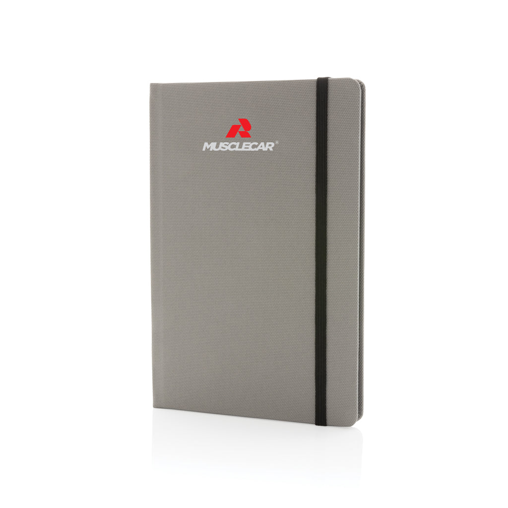 Taccuino A5 in RPET certificato GRS. Variante in grigio disponibile in 4 colori