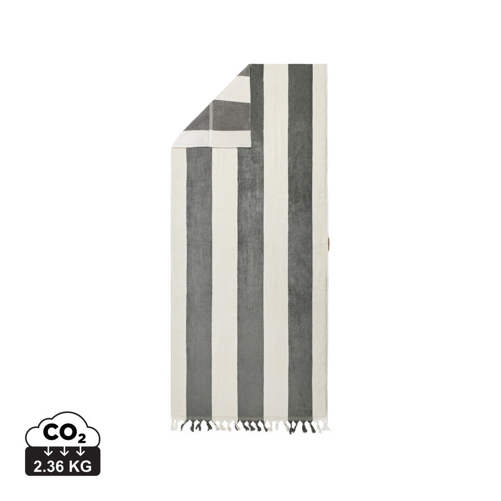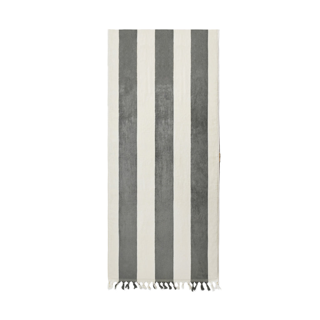 Lussuoso telo da mare in cotone, con frange su uno dei lati corti e una pratica tasca per la sedia a sdraio sull'altro lato utile per tenere l'asciugamano in posizione. I nostri teli mare 450 g/m² sono realizzati in India con il 100% di cotone da coltivazione biologica. 450 g/m²