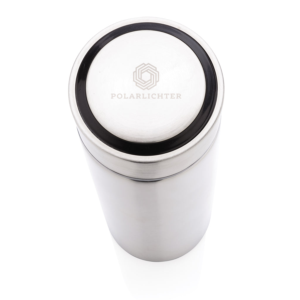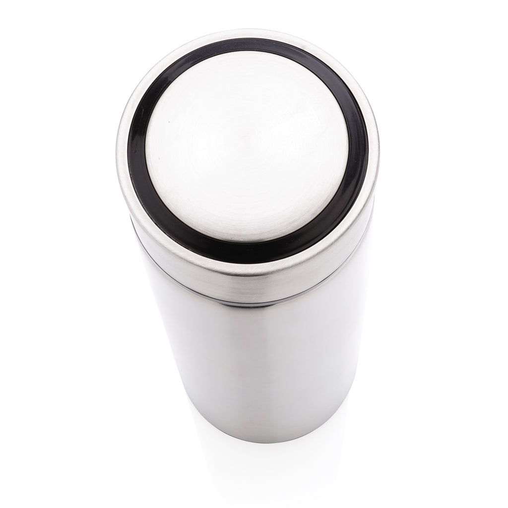 Conserva il tuo caffé o il tuo te buono e fragrante grazie a questa bottiglia in acciaio inossidabile con tappo in metallo spazzolato. La bottiglia include un tappo a vite e permette di bere da qualsiasi angolazione. La grande apertura superiore facilita la pulizia. Capacità 450ml. Senza BPA. Capacità L 0,45