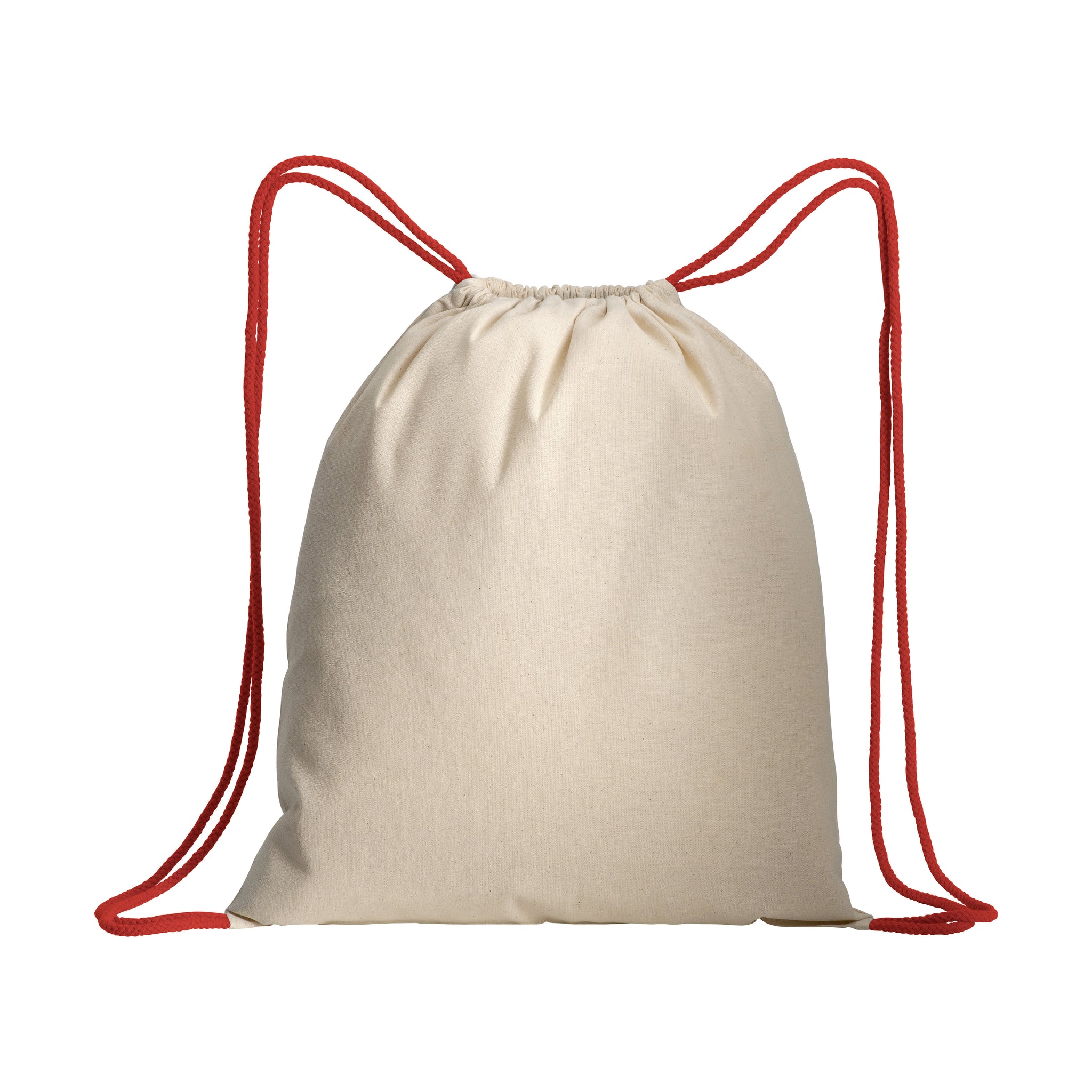 Zainetto in cotone naturale con chiusura a strozzo e cordini colorati. Modello in rosso disponibile in 6 colori