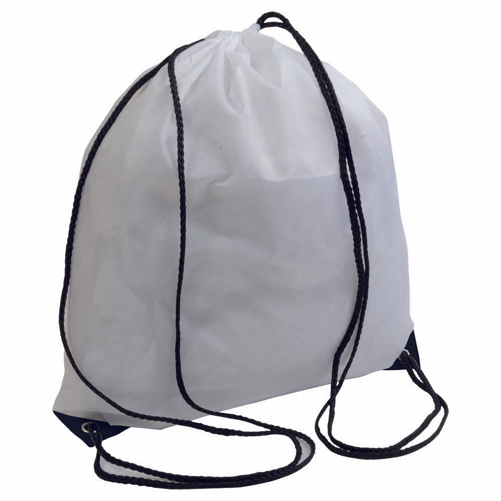 Zainetto bianco in poliestere 210 T con chiusura a strozzo, angoli rinforzati e cordini colorati