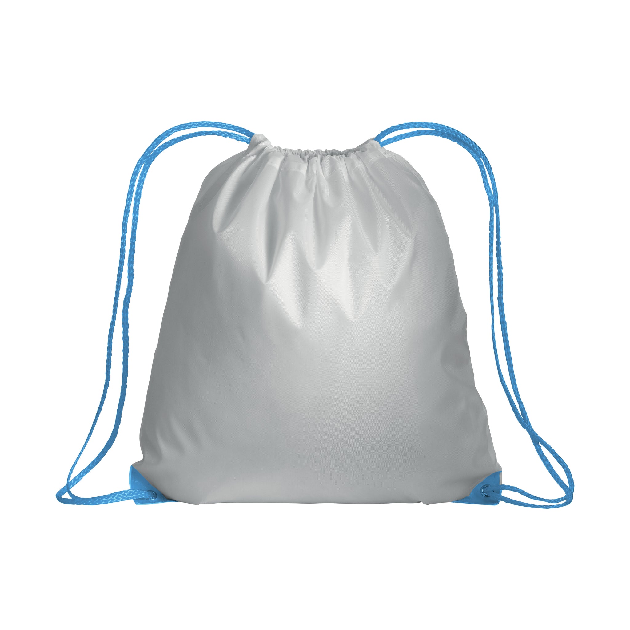 Zainetto bianco in poliestere 210 T con chiusura a strozzo, angoli rinforzati. Articolo in azzurro disponibile in 7 colori