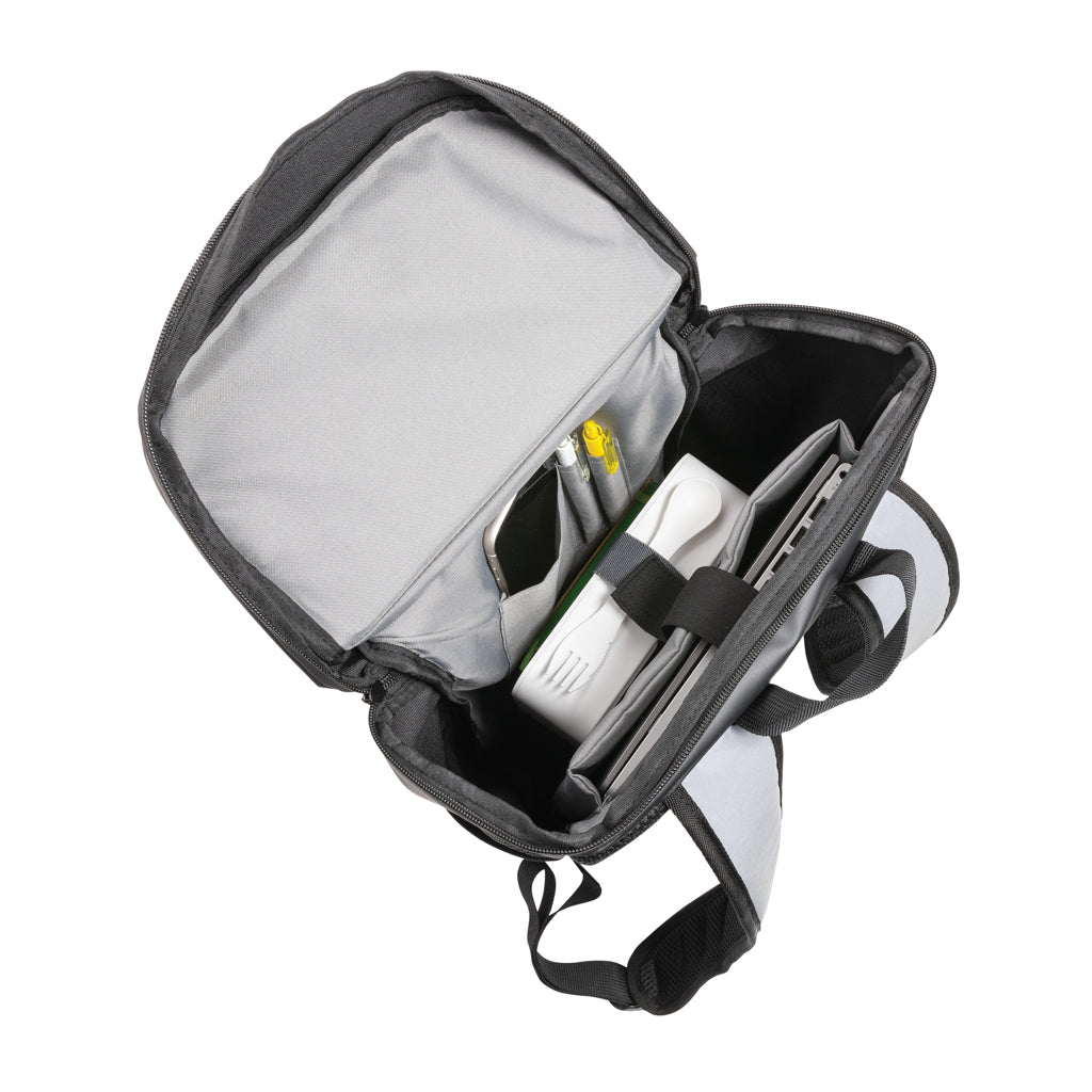 Questo zaino porta PC ad alta visibilità e di facile accesso è ideale in ogni occasione e offre una sicurezza extra grazie all'ampia superficie in materiale riflettente. Il materiale riflettente ti assicura di essere visibile al traffico di notte. Utilizzalo come borsa da tutti i giorni o come bagaglio a mano. L'ampio scomparto principale ha una tasca per PC da 15,6" e una piccola tasca per prendere rapidamente il telefono o le chiavi. L'ampia apertura con cerniera consente di vedere facilmente cosa c'è nello zaino a colpo d'occhio. Resistente all'acqua. La riflettività è stata testata in conformità con EN 13356:2001. Capacità L 12