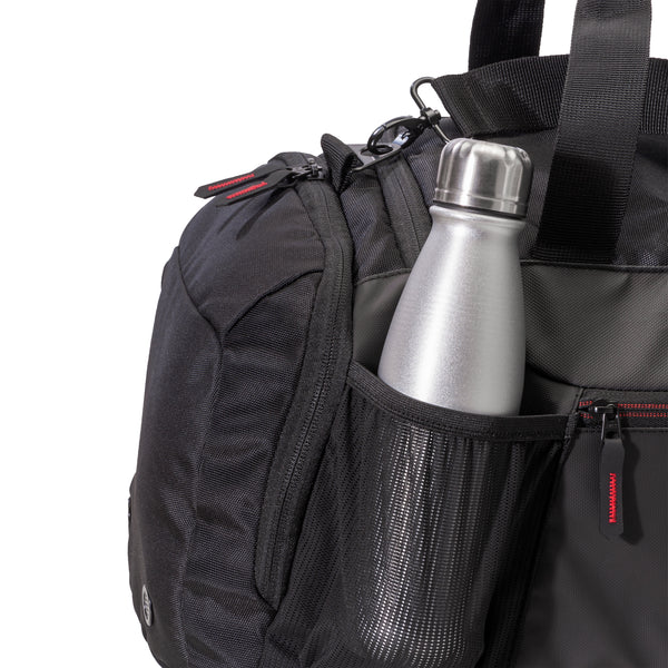 Borsone/zaino in poliestere riciclato (R-PET) . Ampio scomparto con apertura con cerniera, uno scomparto porta scarpe, una tasca laterale con cerniera, tasca laterale porta bottiglia in rete. Spallacci imbottiti regolabili.